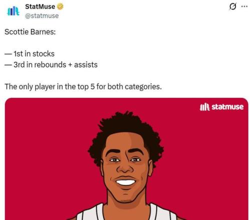 这也是巴恩斯本赛季整体全能表现的缩影,开季至今,24岁的巴恩斯场均可以拿下19.4分8.3板5.4助1.3断1.4帽数据。